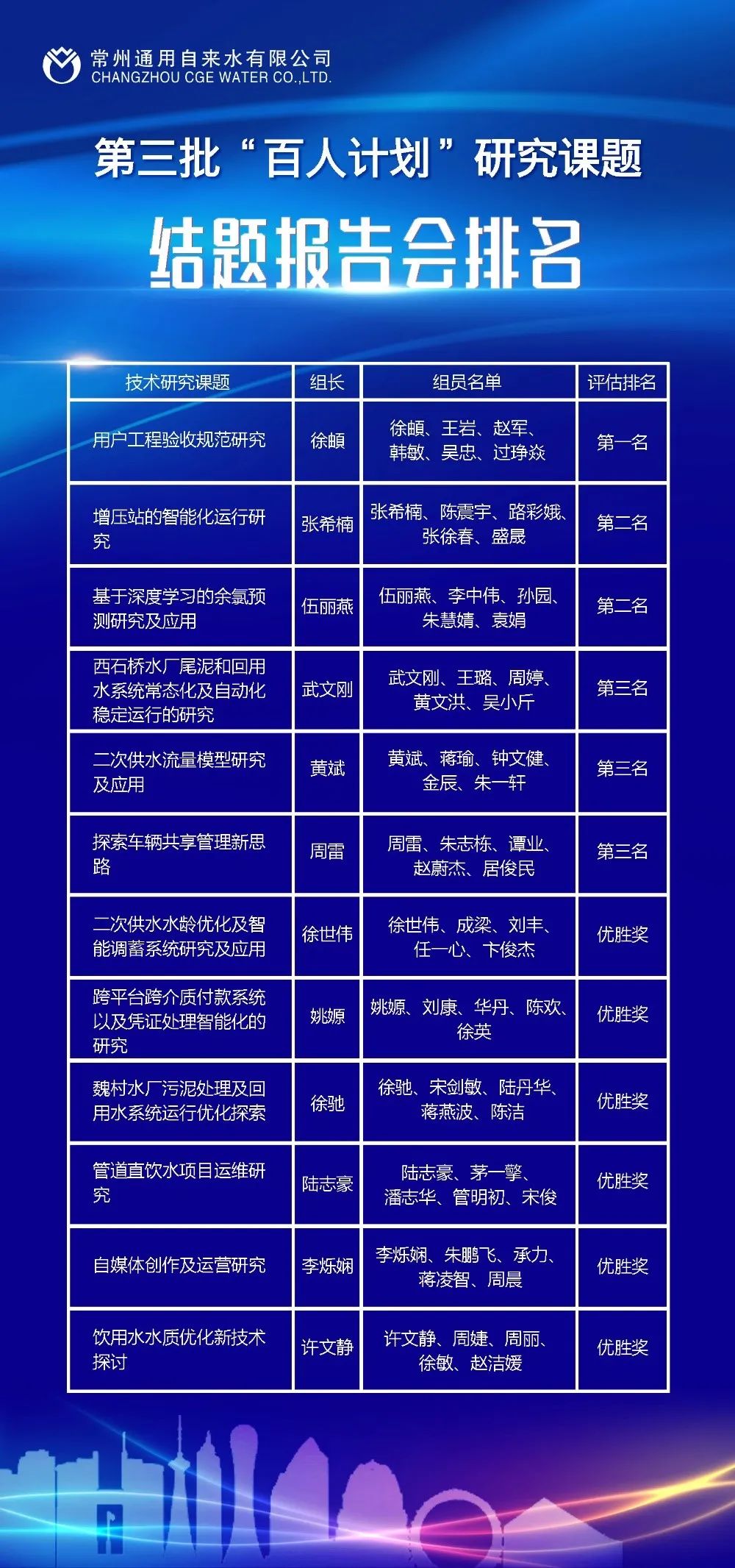 第三批“百人计划”研究包括“用户工程验收规范研究”“增压站的智能化运行研究”“西石桥水厂尾泥和回用水系统常态化及自动化稳定运行的研究”“基于一级分区计量的漏损控制管理研究”“生活饮用水中有机物检测方法的技术研究”等20个课题。这些课题涵盖客户服务、绿色节能、智慧运营、净水工艺、安全生产、管道直饮水、自媒体运营等多个技术研究管理方向,共有100人参与其中。